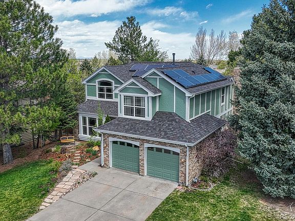Amazing cul de sac location in highly desired Castle Pines neighborhood, in the nationally recognized Douglas County School District. Walking distance to local trails, parks, schools, and the HOA community pool and courts. Close to Daniel's Park with the most incredible views in the front range, as well as multiple world class golf courses. Recent upgrades include newer Class 4 Impact Resistant roof, upgraded roof vents and air returns, fully owned Tesla Solar Energy system (completely paid off, NOT leased!), newer garage door and openers, newer 3.5 ton 13 Seer Central AC unit, newer laminate flooring, newly stripped and refinished hardwood flooring, newer upgraded low pile carpet and padding. Mature landscaping, covered front porch, fenced backyard, composite deck, flagstone walkway and beautiful sitting area welcome you on the outside. On the inside you will find a highly desired open floor plan featuring an inviting entry/foyer; living room with crown molding; formal dining room; main floor bedroom/office w/french doors; main floor bathroom w/shower; spacious family room w/vaulted ceiling, skylights, brick accent wall with mantel, wood burning fireplace with blower, wood beam accents; kitchen with eat in area, lots of natural light, pantry, gas cooktop, island, double oven, wood floors; and laundry room with the washer and dryer included. Upstairs, you'll find the primary suite with a vaulted ceiling, ceiling fan, cedar lined walk in closet, and 5 piece attached bathroom featuring an upgraded shower and skylight. Also upstairs is a loft with built ins & upgraded iron baluster railing, 2 more bedrooms, and another full bathroom (with double vanity). The large basement includes shelving & work bench. 2 car attached garage. Easy access to I-25, Highlands Ranch, Denver, and Castle Rock.