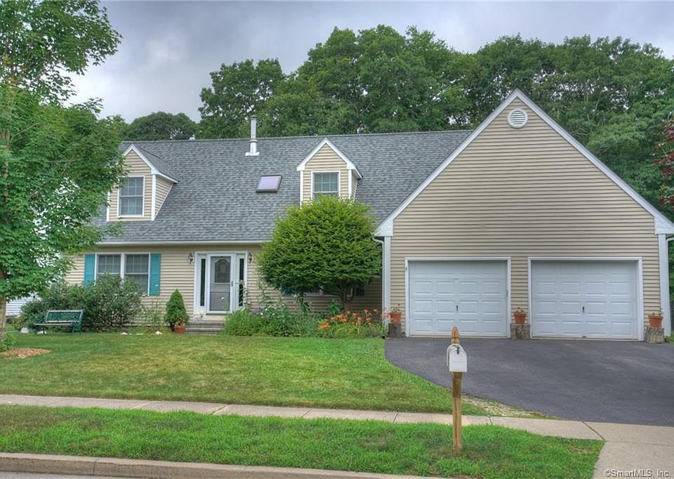 Remarkable large Mystic Cape Cod with dormers has 4 bedrooms, 3 full double-sink baths, and one half bath in a desirable neighborhood with sidewalks that backs-up to the town open space. 2412 sf with updated stainless steel appliances in the kitchen,a formal dining room, a den, and a wood stove in the living room, gives it that cozy room feeling to relax in after a long day. If you love to be organized and have your own private space, the library will be one of your favorite rooms, with its elegant white built-ins. Convenient main level bedroom, with 3 additional bedrooms upstairs. All upper level bedrooms have recessed lighting, and beautiful skylights that provide lots of natural light. Upper main spacious bedroom comes with its own private bath! Full basement with walk-out from lower level family room leads to a natural stone patio. Attached 2 car garage, and well manicured yard, including a garden area, Koi fish pond, stone walls, a shed, numerous fruit trees in shaded area, and a firepit to enjoy the evening outside by.