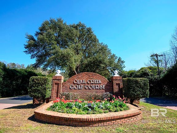 Welcome to Quail Creek Villas, Gold Fortified, custom-built (2017) brick home by Ray Roberds in the heart of Quail Creek's desirable 18-hole golf course community. A breath of fresh air upon entering this custom home with the many custom details; crown moulding throughout, engineered hardwood flooring in the living room, dining room, kitchen, breakfast room and primary bedroom. Tile in the baths and laundry room. Stainless steel appliances in the kitchen, deep stainless steel sink w/a wonderful touch faucet, abundant custom shaker cabinets with wood shelving, and granite countertops. You'll love the extra wide pantry and 2" blinds already installed. There is a breakfast bar, pendant lighting, recessed lights throughout, gas log fireplace, and windows across the back to let the natural light flow. Extra wide doorways for easy accessibility. The primary suite includes a large walk-in closet and wood shelving. The En- Suite has double sinks, custom bathroom mirrors, soaking tub, and a separate shower. Split bedroom plan allows for privacy. Perfect plan for entertaining family or friends on the huge covered back porch. Fully landscaped yard with irrigation system, gutters, storm window fabric shield covers, alarm system, and full staircase leading to the attic for ample storage upstairs and an extra storage room off from the garage. All the amenities needed in one of the finest properties available in this golf course community in Fairhope. No HOA dues, however, for a small annual fee one can enjoy the private pool club. New public Pickle ball courts and golf course available. Close to Fairhope shopping, schools. restaurants, and attractions. Minutes to Mobile Bay and less than an hour to Gulf Shore's Gulf of Mexico's sugar white beaches. Schedule your showing before it's SOLD!