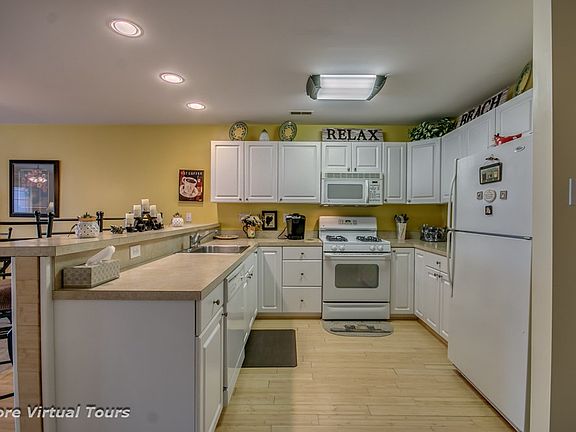 Great Location! Unit is in walking distance to beach, boardwalk and entertainment district. There are 3 bedrooms, 2 full baths, kitchen with snack counter, large pantry closet, open floor plan with dining area, living room with gas fireplace and glass sliders from front bedroom and living room leading to extra large covered porch, utility room with full size w/d, garage parking for 2 cars plus parking pad and private storage room approx 24'x15'. This unit has never been rented. Is sold fully furnished and turn key ready. Excellent rental location for an investment property