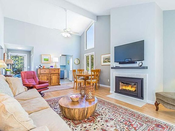 Ranch-style end unit with finished basement in Falmouthport. Private wooded location with large back deck, close to walking trails. Wonderful open floorplan with 2 bedrooms and 2 baths on the main level along with a spacious living room with vaulted ceilings, oversized slider and new gas fireplace insert. The kitchen is updated and the living space has wonderful, natural light! The primary bedroom has a private bath, 2 closets, vaulted ceiling and slider to outside deck. Recent updates include new windows and doors, freshly painted throughout, and custom closet built-ins. Falmouthport offers a clubhouse, walking trails, access to Great Pond, heated swimming pool, tennis and pickleball courts.