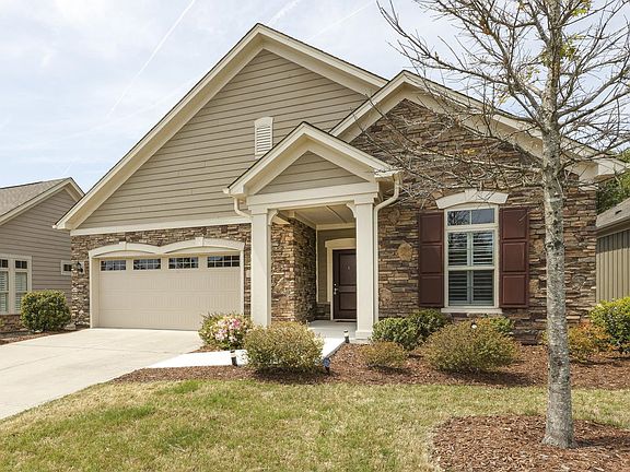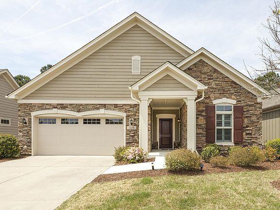 Come see this lovely home with a finished basement in this upscale 55+ community. From the hardwood floors, plantation shutters, 9 ft. ceilings and more, this home has all the touches of elegance you need. The primary bedroom has direct access to the screened in porch, brand new carpet and fresh paint. The primary en suite has a dual vanity and walk-in shower with safety bars. The main floor also features a second bedroom with new carpet, a full bath, an office space with glass French doors, a chefs kitchen and a great room with a gas fireplace and built-ins. The lower level features a very large bedroom with a closet and a full bathroom with additional unfinished space offering plenty of storage. Enjoy the privacy of the backyard while sipping your morning coffee on the back deck or from the screened in porch. Easy access to dining shopping, medical, NC-540 and the American Tobacco Trail.