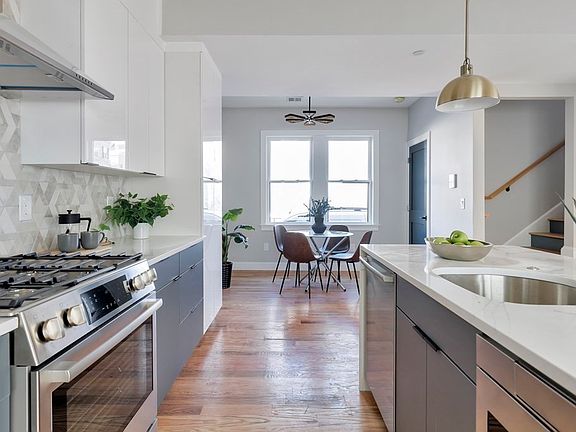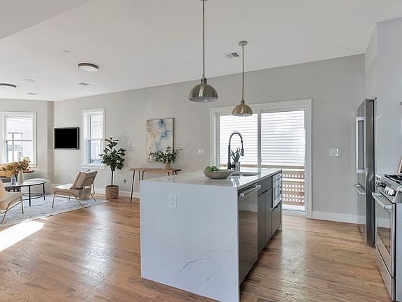 Largest unit in this beautifully renovated building offers a 3-story living style that keeps a perfect balance of entertaining and relaxation. The first level boasts hardwood floors, natural light, high ceilings, and direct access to almost 400 sf of finished lower level. An inviting kitchen with gorgeous two-tone cabinets, high-end stainless steel appliances, and a quartz countertop featuring a waterfall island that seats 4. The kitchen seamlessly connects the open living room to the dining area. A crisp powder room completes this floor. Two ample sized bedrooms with large windows, two beautifully designed bathrooms, and the laundry closet rounds out the 2nd floor. This condo has it all - central air, driveway parking, a private side yard and a large fenced-in shared yard. Nestled in Inman square close to the Green line at Union Square and the Red line at Central Square. Easy access to shops, restaurants, MIT/Harvard campuses, and just 3 blocks from Donnelly Field!