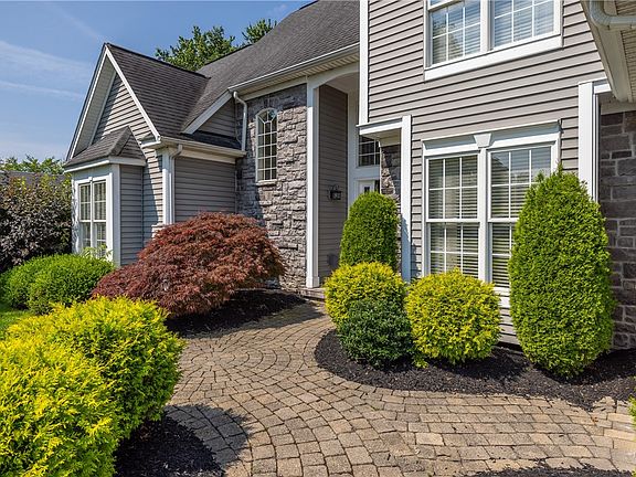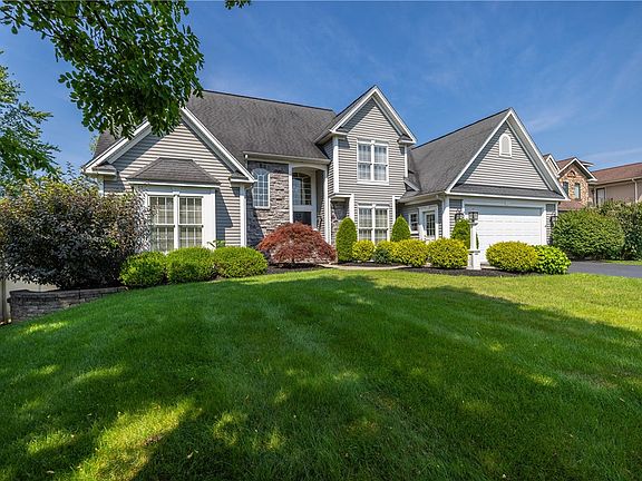 Location-Location-set on the 13th tee of Eagle Vale! Close to all-shopping, restaurants, expressways, Fairport Village & Penfield Village, parks and more! Open 2 story foyer greets your guest! Great room with views of Eagle Vale-Gas Fireplace with custom wood/tile surround-also has doors that can be attached above. Carpets freshly cleaned 7/24. Main level office with tray ceiling. Fantastic Sun room with French doors to dining, tiled floor, access to stone patio and great views! Open layout to kitchen and dining with breakfast bar seating and maple cabinetry. Pantry closet. 1st floor mud room area and separate laundry room with washer/dryer, sink and counter/cabinets. All appliances to remain. 1st floor Owners Suite with Jacuzzi tub & separate shower, and walk-in closet. 2 Spacious bedrooms upper level bedrooms with closets and main bath. 200 amp electric. Hot water heater 2021. Great basement/lower level (unfinished) but prepped for future rec room, family room, play room etc.! 2.5 car garage - extra deep with 2 people doors. FAIRPORT ELECTRIC!