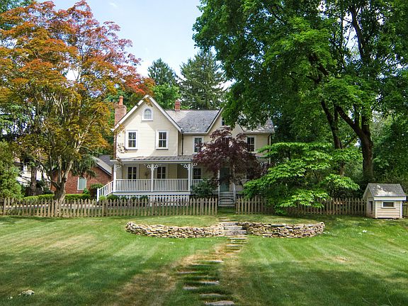 Beautiful, updated Victorian farmhouse in Old Fort Washington. A large, covered front porch provides the perfect place to relax and overlooks the charming, fenced front yard, complete with matching dog cottage which has been wired with electric. Upon entry you are greeted by a lovely, wooden stair case. The inviting dining room is enhanced by decorative molding and hardware floors that extend throughout the entire house. The fantastic, eat-in kitchen is filled with many cabinets and decorative details. Kitchen doors lead to both a stone patio and a large, screened-in porch. The over-sized living room showcases a beautiful fireplace and French doors that open out to the front porch. Stepping down from the living area, you will find a glamorous library filled with bookshelves. The first floor also includes a tiled, back entryway, tiled laundry room, coat closet, desk area and powder room. Upstairs, you will find the Master Suite. The spacious bedroom is complete with a walk-in closet. The glorious Master Bath boasts a dramatic vaulted ceiling, marble floor, bathtub and separate shower. Three additional bedrooms are serviced by a central, full bath and linen closet. The 3rd floor provides even more space for an office or playroom. Full Basement, with one half finished and sound-proofed, perfect as a theater or sound studio. The entire basement has been waterproofed by BQ Basements and includes two sump pumps. Detached, two car garage and mature landscaping with herb garden. Additional details of interest: slate roof, copper gutters and flagstone pathways.