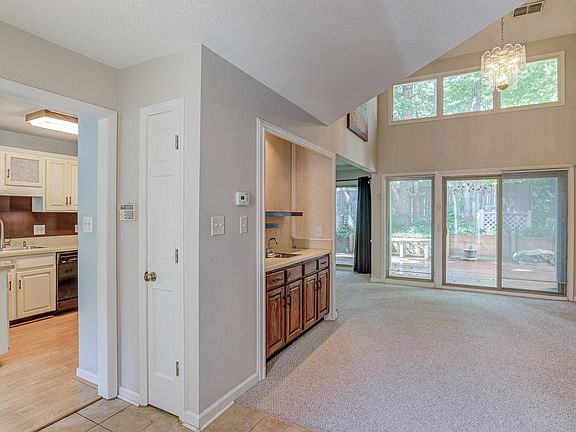 Not your run-of-the-mill townhouse. Two-story family room with wood burning fireplace and wet bar. Large dining room. Eat-in-kitchen has a bay window and opens onto a patio. Quartz counter tops and all appliances. Deck off family room and dining room is 25' x 12' and has the true feeling of a townhouse courtyard - very private and open to many landscaping possibilities. Guest bedroom on main level opens onto its own patio - very charming. Master bathroom has dual vanity, jetted tub and water closet with toilet and shower. Walk-in master closet. HVAC has high tech air filtration system with transferable maintenance contract - HWH is included. Roof to be replaced by HOA in a few weeks. Detached oversized 1-car garage. Amazing location in the heart of Cary. Walk to shopping and dining. Close to US1, I440, I40. Lake community.