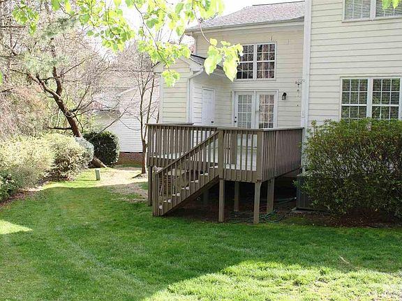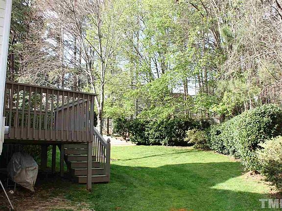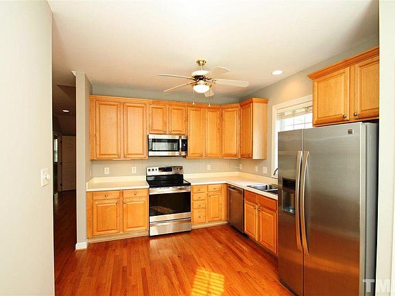 Heart of Cary End Unit TH with a private yard that backs to woods. Features a master on the main level, walk in closets for all BR's. Hardwood floors in formals. New carpet in BR's. Newer stainless steel appliances in kitchen. Kitchen has window over sink, bay window for nook and beautiful light maple cabinets. Baths have ceramic tile floors. Dual vanities in both the master and hall bath. Separate tub and shower in MBA. Seller offering washer, dryer and refrigerator. Fresh paint makes this look new!