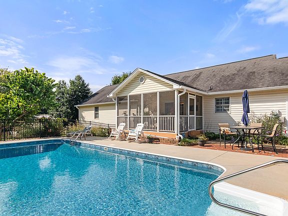 This exquisitely maintained 3 bed/2 bath home is the one you've been waiting for! Features include vaulted ceilings, hardwood floors, high quality plantation shutters throughout, beautifully updated primary bath with dual vanities and huge walk in shower, lovely screened porch w/ Trex flooring overlooking a sparkling inground pool, and more. BRAND NEW HVAC in August 2023. NEW 6" gutters and downspouts in 2022. Spacious 2 car garage with additional matching outbuilding. The outbuilding has windows and an A/C unit and could be used as a great workshop, living space, or for storage. This lovely home sits on a large lot and feels very private with the surrounding open land. Enjoy the peaceful countryside while sipping coffee on your screened porch overlooking your own outdoor oasis! Sellers can not move out of the home until the end of the year.