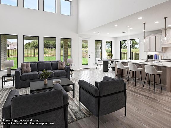 Home office with French doors set at two-story entry. Formal dining room opens to curved staircase. Kitchen and morning area open to two-story family room. Kitchen features generous island with built-in seating space and 5-burner gas cooktop. Family room features a wood mantel fireplace and wall of windows. Primary bedroom features 12-foot ceiling. Primary bath includes dual vanity, freestanding tub, separate glass-enclosed shower and oversized walk-in closet with access to utility room. A second bedroom is downstairs. A game room, media room and secondary bedrooms are upstairs. Extended covered backyard patio. Mud room off three-car garage. Representative Images. Features and specifications may vary by community.