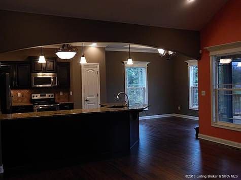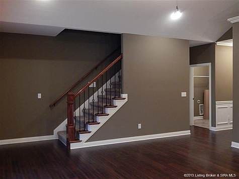 Custom built Infinity Home! The Muirfield II, one of Infinity's most popular floor plans. This home offers hand scrapped engineered HARDWOOD floors, OIL RUBBED BRONZE faucets and fixtures, GRANITE countertops with beautiful tile backsplash, oval and rounded tray ceilings, STAINLESS STEEL appliances, exquisite TRIM work, and UPGRADED CABINETRY. Great room features a fireplace, beautiful archways, and bull nose corners. The basement features a WET BAR for entertaining, FAMILY room, RECREATION room, 4th BEDROOM, FULL BATHROOM, and still plenty of room for storage as well! Owner is a licensed real estate agent.\n\nInformation Deemed Reliable But Not Guaranteed. Information provided by the Southern Indiana REALTORS® Association, Inc. © 2010 SIRA Multiple Listing Service. All rights reserved. Brokered And Advertised By: RE/MAX FIRST Listing Agent: Heather Robinson