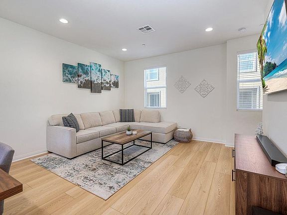 Welcome home to 229 Mission Villas Road, this beautifully maintained, upgraded condo built in 2022 in San Marcos offers a laid back, turn-key lifestyle. Step into the open floor plan with no one above or below, fully owned solar, bonus windows on the main level bring extra sunlight highlighting luxury vinyl plank flooring with upgraded padding, recessed lighting, and a seamless flow from the living and dining areas to your private balcony. Directly off the living room you will find a nicely appointed powder room with pedestal sink. The highly upgraded kitchen includes quartz countertops, under-mount single basin sink and Moen matte black faucet, upgraded cabinets, stainless appliances and custom lighting fixtures as well as touchscreen smart wifi electric range, energy star dishwasher and microwave/hood combo, welcoming you into a space to entertain or just relax on a quiet evening at home. The laundry closet has upgraded additional shelving/cabinets and includes newer stackable washer and dryer and a bonus window in hallway. Relax and unwind in the quiet primary bedroom with walk-in closet, ceiling fan and extended double vanity with cultured marble countertops accented by black matte faucets and yet another bonus window in bathroom. The second bedroom offers a full bath with upgraded faucets and marble countertops. Two car garage with direct access into the home and space for storage. Perfectly located close to shopping, restaurants, easy freeway access, Sprinter train station, Cal State San Marcos and Palomar College, and so much more! Ammenities include Bocce Ball, dog run, playground and BBQ area.
