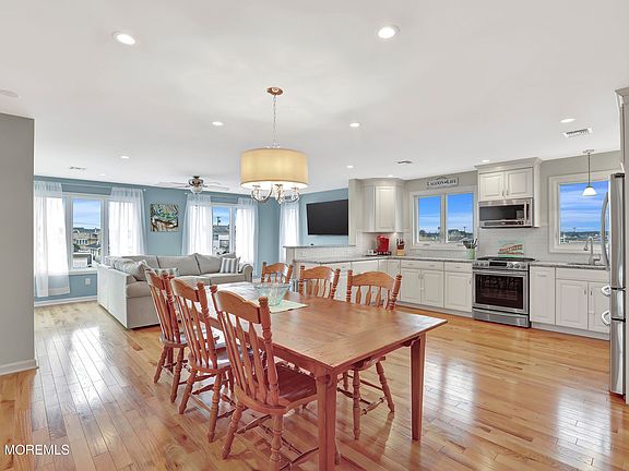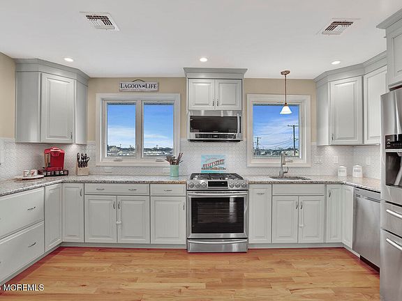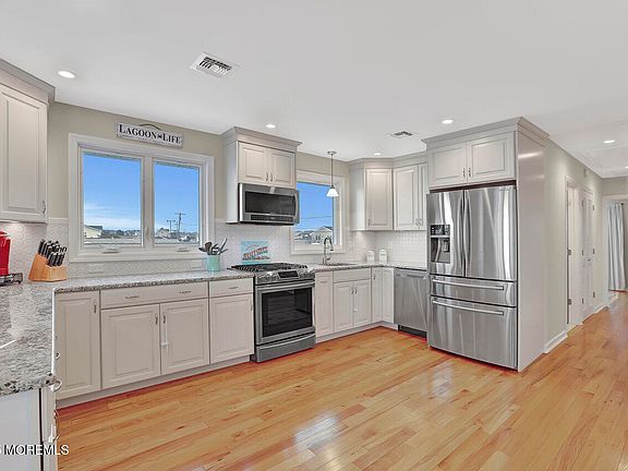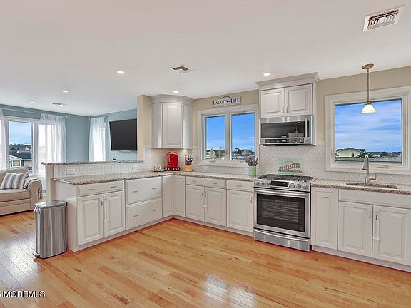 Start the summer season in your new shore home. This fully renovated, raised waterfront home offers the very best of shore living: three large bedrooms (plus a bonus room), two full bathrooms, new hardwood floors, a brand-new dock and 60-foot bulkhead, sprawling outdoor space and panoramic windows offering a stunning view of the lagoon. Enjoy tons of natural light in the open concept living room and beautifully renovated kitchen with stainless steel appliances and granite countertops. Step out onto a full deck overlooking the wide lagoon, the perfect place to enjoy your morning coffee or an evening cocktail while you watch the sunset. The lower level offers space galore for endless, effortless storage or future refinishing to your very own design for even more space. Ground level sliding doors open onto a covered patio that offers yet another place to look out over the water and enjoy the coastal breeze. The property is entirely hardscaped for nearly maintenance-free living. With a two-car heated garage, plus plenty of parking, this home is perfect for entertaining or if you prefer, your own peaceful oasis. Close to Shore Beach! You will not be disappointed! Easy to show. (And hard to forget!) Don't let this one go.
