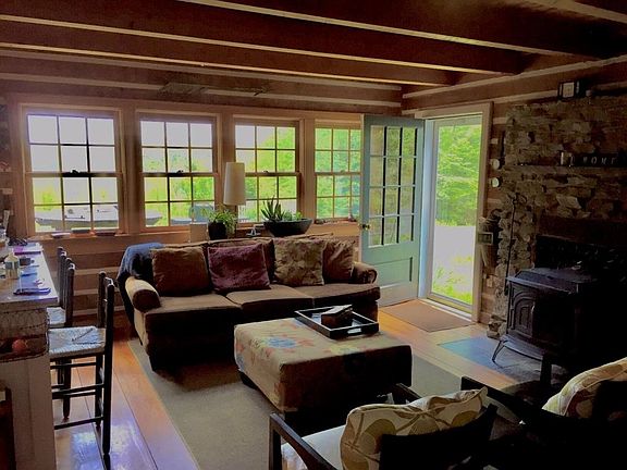 This log home was built in 1990 of Southern cypress. The home has 3 bedrooms, 2 1/2 Baths. It is located in the town of Sunderland offering school choice for middle and high school. The views to the west offer grand sunsets every day! There are 3 out buildings, 2 streams that traverse the property, about 1 acre of lawn and beautiful lillies, with space for additional gardens. The home is efficient, all propane; furnace, stove, hot water and dryer. There is a fireplace with a wood stove, Firewood is abundant on the property. Power is underground. A two car attached garage enters the home. Updated appliances, furnace, and a new roof in 2016.