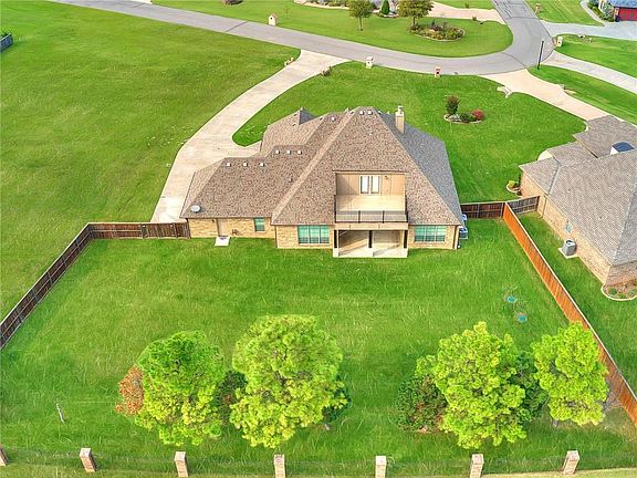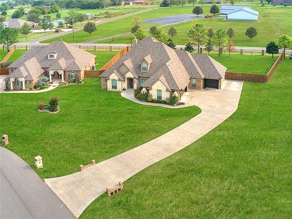 Gorgeous custom built home in the Goldsby area. Only 5-Min drive to Norman. This like-new beautifully maintained home has the perfect open concept for entertaining. Home is loaded with knotty alder wood and doors, custom front door, 2x6 construction, built ins in study and breakfast buffet, solar board roof decking, Carrier HVAC, two tankless InstaHot hot water tanks, granite everywhere. Master suite and two bedrooms are down stairs. Upstairs you will find game room with doors leading to balcony, media room, 4th bedroom full bath, along with walk in attic storage. Master bathroom is a dream come true. Shower has separate spray jet system with bench, large jetted tub, huge walk-in closet. The two down stairs bedrooms share a spacious jack-n-jill bathroom. Complete with an above ground storm shelter safe room holds 10 people!