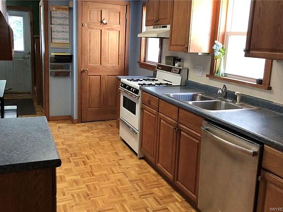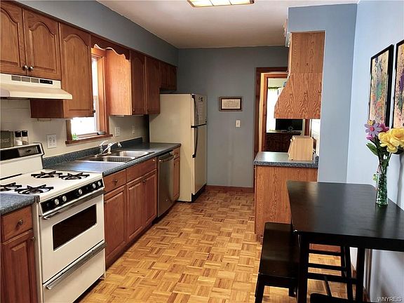 4 bedroom Colonial with updated bath and large eat-in kitchen. Welcome to 229 Olmstead in the village of Depew. Enjoy the covered porch that so many are looking. Kitchen with dishwasher and wood floors. Living room and dining room are connected to allow you to choose the size of each room. The large first-floor master has a double closet and sitting area. The three bedrooms on the second floor give you another option of which room to be your master bedroom. Bathroom is updated with neutral decor. The side entrance adds convenience to the kitchen. The walkout basement has a large laundry area, playroom, and still room for storage. Glass block windows. The garage has extra storage too. Check out the yard behind the garage. Furnace less than 5 years old. Roof 2009