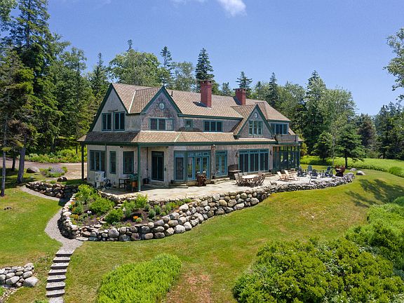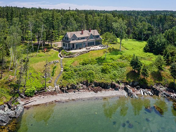 This spectacular oceanfront home was constructed in 2002 in the tradition of a classic Islesboro cottage. Located on the north-western shore of the island near Seal Cove, the open and airy waterfront residence is situated on 35.5+/- acres of land protected by Islesboro Island Trust and features 500 +/- feet of shorefront with west facing views looking over Penobscot Bay and back to the Camden Hills. There is a fantastic and easily accessible private pebble beach area, and wide open views of the water. With first and second floor primary bedroom options, this four bedroom, four and a half bath home also includes beautiful gardens, open lawn, dramatic ledges, a large and inviting stone patio overlooking the ocean, and a screened porch. The home has been recently updated with a new roof, heat pumps added for heating and cooling, new generator and shed storage area, new stairwell down to the beach area, and it will convey fully furnished for your immediate enjoyment. Great basement with a second laundry area, and tons of easily accessible storage space. This is a beautiful and turn-key island home.