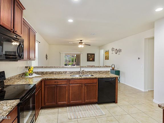 * Relax & enjoy the large east facing backyard for lovely morning light + mountain views & a partial fence...all from the extd paver patio w/pergola. Inside features include 18'' tile, carpeted bedrooms, 2'' faux wood blinds, & 9 ft. ceilings. Kitchen w/ GRANITE counters, c Birch cabinetry w/crown molding, pantry & new Samsung Refrigerator. Master has double sinks, + walk-in shower & closet. Guests will appreciate their own bedroom & bath w/tub & shower. The home's entrance features an expansive porch for relaxing, watching amazing Arizona sunsets or visiting w/ neighbors who pass by + a security screen door to allow the breezes to pass through the home. The 2 car garage w/extra Frigidaire Freezer & soft water loop. This 55+ community has golf, billards, pool/spa, tennis/pickleball + more!