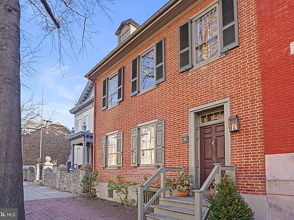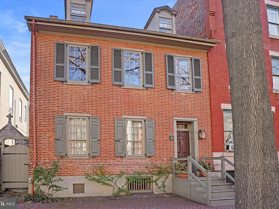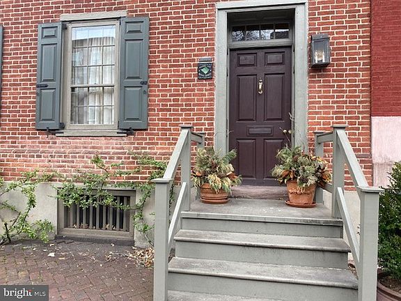 Rare opportunity to own this Pristine Historic home situated in the Callowhill Historic District. This all brick home comes with 4 bedrooms, 2 baths and is an end unit that has been lovingly cared for. Originally deeded to William Penn's son, the original home, where the kitchen is located, was built in 1795 with the addition coming in 1810! As you enter the foyer, you will immediately notice all of the architectural details this home has to offer. There are stunning hardwood floors throughout the home, which have been kept in pristine condition. The formal living room has a beautiful fireplace with a very detailed mantle and is flanked with built-in cabinetry. The formal dining room is adorned with crown molding and chair rail and looks over the terrace and large garden. Cooking will be a delight in the updated kitchen with custom cabinets, a center island with seating, farmhouse sink, tile backsplash, recessed lighting, a Viking gas cooktop range, refrigerator, built-in microwave, bamboo flooring and a gorgeous beamed ceiling. There is also access to the large, private courtyard. The second level greets you with three bedrooms, one with built-in bookshelves, and another with a fireplace and built-in cabinetry. There is a full, updated bath with a double vanity and lovely glass shower with tile. The third floor holds the primary bedroom with a beautiful cathedral, beamed ceiling, built-ins and its own full, updated bath. Storage is not an issue as there is plenty of closets and an exterior shed and full basement. The yard is completely fenced for tons of privacy and has a brick patio and lots of trees and beautiful perennial flowers. The home comes with 10 ft. ceilings, central air, some replacement windows and tons of history.