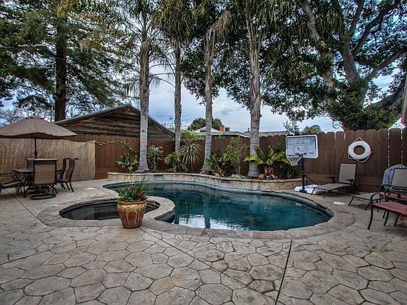 Unbeatable combination of style and charm exudes this highly updated home with gorgeous back yard oasis with pool and spa. This beauty has a extra large family room that is perfect for weekend movie nights and space for the whole family. The cozy fireplace will will keep everyone warm on cold nights. Rich hardwood floors lead you through the family room and into the elegant and separate formal dinning. The kitchen has beautiful granite counters and upgraded appliances. Built in breakfast nook with seating only adds to the appeal combining beauty and functionality together in one package. Large inside laundry room! Outdoor entertaining is at a premium with a beautiful patio overlooking a custom pool and hot tub. This is all landscaped with custom stamped concrete, lighting and palm trees. Detached 2 car garage perfect if desired to be a workshop with the combination of a long driveway for parking.