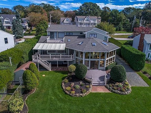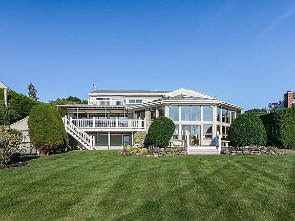 Jamestown Shores - Wonderful waterfront contemporary with private dock, overlooking the West Passage of Narragansett Bay. Enjoy the afternoon SW breezes, wonderful sunsets, and the ability to swim or tie your boat up to the dock. The spacious interior offers walls of glass, hardwoods, granite kitchen, 1st floor master suite with oversized handicapped accessible shower, whirlpool tub, and walkin closet. A lavette also serves as laundry room on 1st floor. The 2nd floor provides an office area, 2 guest bedrooms, a full bath, and a spacious family room with bar area, and multiple west facing decks overlooking the lawn down to the waters edge. The vaulted sunroom with hot tub and endless pools current pool, has views of the bay, and is ideal for therapeutic needs. The lower level offers a workout area, sauna,extra kitchen, sitting area and full bath. The house has radiant, hydro-air heating/cooling, as well as mini-split AC units. The grounds are meticulously maintained including sprinklers, koi pond with waterfall, and multiple sheds. The dock features a large float, ramp, electricity & lighting, and there are 2 sets of mooring hardware that will convey. A must see for the boating enthusiast or those who enjoy sunsets.