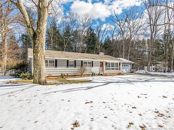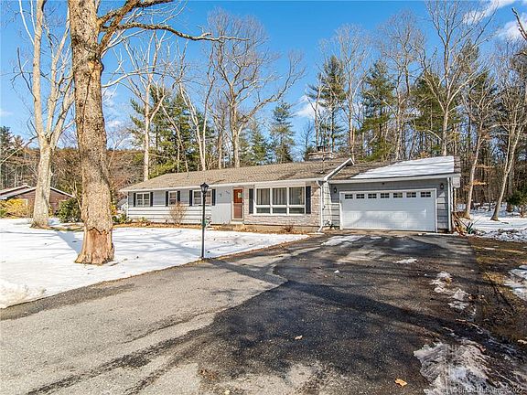 This cozy, well-lit ranch home sits on a lightly treed lot in highly desirable Woodstock CT, just minutes from downtown Putnam, all its amenities, Woodstock Academy, Woodstock Fairgrounds, and Bull Hill Forest Preserve. Upon entrance, you are warmly greeted by hardwood floors, a beautiful stone fireplace in your living room, an open floor plan from your living room to your dining room, glass sliding doors from the dining area that lead to your sun room with a fireplace of its own. From your sunroom head out into your large backyard, with two storage sheds, that abuts the state forest, or into your 2 car attached garage. From your dining room look into your eat-in kitchen with newer cabinets and newer appliances. On the main floor are three bedrooms, two full bathrooms, and hardwoods throughout. Updates include new roof and gutters in 2021, engineered septic system in 2013, oil tank in 2018, fireplace flashing and capped in 2021, two-stage well jet pump in 2021, stone patio in 2014, updated kitchen in 2014, new washer, dryer, and stove will be installed prior to closing. Make this home yours with some fresh paint and a few updates Schedule your viewing today as this home will not last long