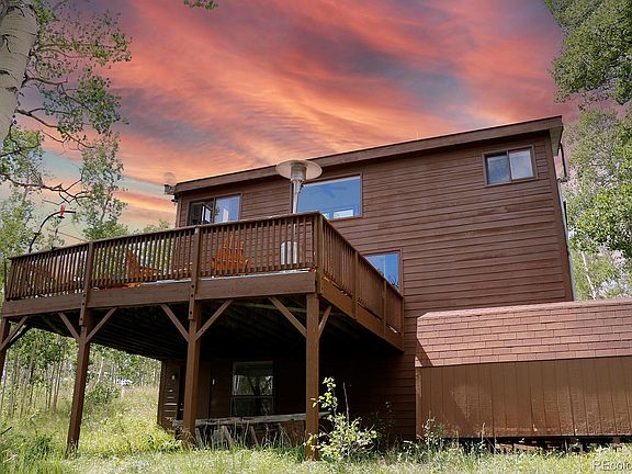 Welcome to your mountain retreat! This 2 bed, 2 bath home sits on 2.5 acres in the coveted gated community of Warm Springs Ranch in Fairplay! Surrounded by lush aspens, the home is filled with natural light thanks to large windows that provide passive solar heating. The living room features a cozy wood-burning stove and a kitchen with dining area. The kitchen opens to a large deck with views of Mt. Silverheels, perfect for outdoor dining and lounging. The main floor also includes a full bathroom with laundry facilities. Upstairs, the airy and sunlit primary suite offers plenty of space. The renovated primary bath boasts new tiles and fixtures, including a soaking tub. The basement has a large bedroom and a bonus room, and a large storage shed can be found in the backyard. Residents can enjoy the National Forest, hiking and snowshoeing trails, outdoor tennis/pickleball courts, and a clubhouse. The subdivision owns the water rights to a spring-fed community water system. Located just a few minutes from Fairplay, less than an hour from Breckenridge, and amid Park County's fishing waters, this home is ideal for full-time living or as a mountain getaway. Short-term renting is possible with HOA and county approval.