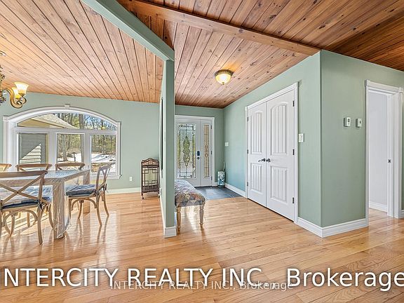 Custom built waterfront bungalowPrivate set back propertySurrounded by mature treesPine cathedral ceiling