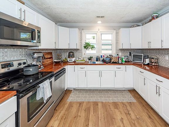 -1500 sqft on 0.34 acre, fully fenced yard - Brick home in nice quiet neighborhood - Greeted by front porch with swing - Large eat-in kitchen, with shiplap accent wall & stainless steel appliances - Kitchen also offers new butcher block countertops; tile back splash & plenty cabinets for storage - Separate dining area with access to fenced in backyard - Lighting throughout home with abundance of windows, offering plenty of natural light - Spacious Living Room with fireplace & new flooring throughout - Ceiling fan in every bedroom & stand-in shower in full bath - Separate Laundry Room - 2 car garage with space for workshop; separate shed for outside storage - Close to shopping, restaurants, military bases! - Available June 2025 No smoking allowed, utilities not included (electric, water & sanitation, water) 1 year lease Tenant responsible for yard maintenance