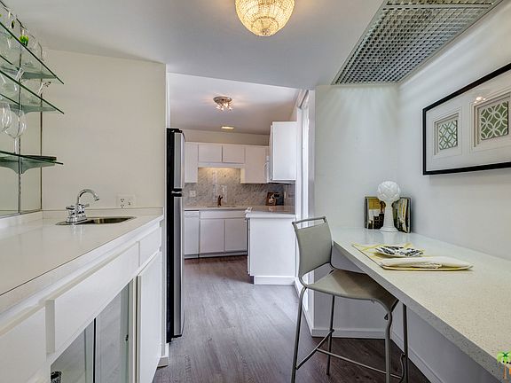 Rarely on the market! This stylish mid-century modern complex is a Class One Historic District that combines classic Roman details with elements of Hollywood Regency design. The units are thoughtfully arranged around the gorgeous common area highlighted by a unique pool, covered lanai and palm trees swaying against the back drop of the San Jacinto mountains. This special unit offers a spacious light and bright open floor plan with clean lines and tastefully chic furnishings. Enjoy your morning coffee or afternoon cool libation on either the private patio, accessible from both the living room and the bedroom, or the open patio gazing at the pool. The Old Las Palmas neighborhood location with the Uptown Design District just outside the door, makes for an ideal haven that is convenient to restaurants, shops and the Village. Other advantages include turnkey furnishings, reduced property taxes through the Mills Act, VRBO seasonal rental history and low HOA dues. Come see for yourself!