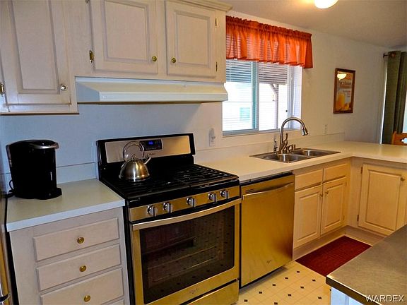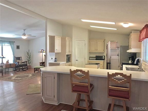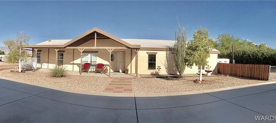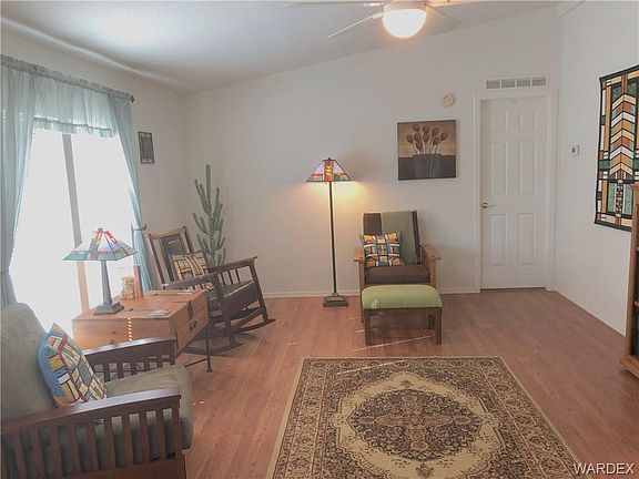 Exceptional home with 8 car/ Boat deep parking garages and 2 Triple Carports. Large corner property with amazing features offers over half acre of land, 2 finished garages ( one is temperature controlled & insulated) and 2 carports. HUGE family room, living room, 3 large bedrooms, 2 full baths and an extra den/ office. Private master bedroom has a walk-in closet, soaker tub plus a separate shower, sitting area and linen closet. Ceiling fan throughout the home, window coverings, fenced back yard with dog run and irrigation system. upgraded flooring, large open kitchen with serving counter and a large dinning area perfect for family gatherings and entertainments. Home has 5 driveways ( 4 have concert pads) from 2 corner streets and a drive thru garage with storage cabinets, AC, work shop plus RV/ Boat parking area. A 600SF stick built addition was attached to the existing home in 2008 with all tiled flooring and a separate AC unit. Very unique Manufactured home, immaculate and in great condition with plenty land to expand. Near 5 championship golf courses, Colorado river, Valley View hospital, Super Walmart, Memorial bridge to Nevada, schools, major retailers and restaurants. Great value and great community to call home.