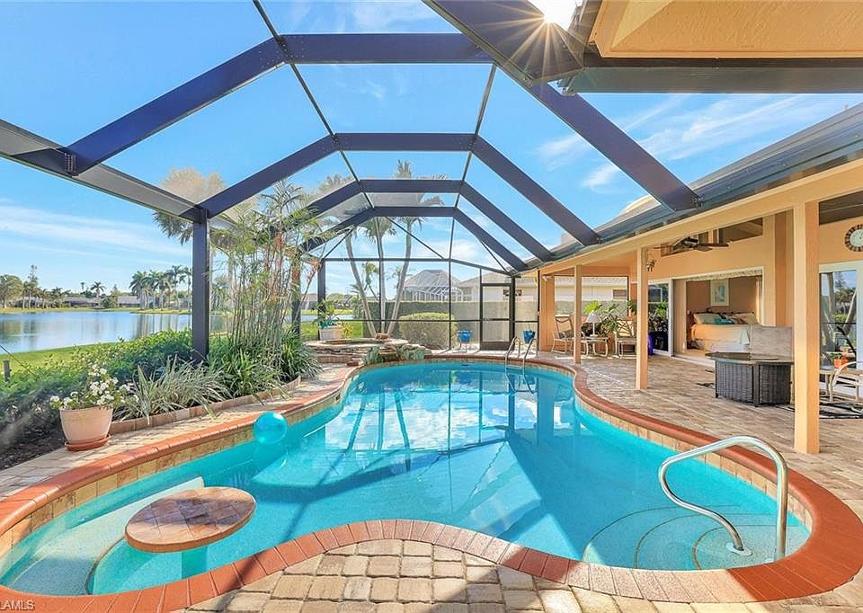 Thoughtfully constructed & lovingly maintained by its original owners, this Kings Lake home sits on a prime oversized lot showcasing a mesmerizing long & wide lake view. Extra care was taken during construction, creating a solidly built home encompassing more than 3,100 square feet of living that will give you comfort. Newer big-ticket items, including the roof, two air-conditioning systems, and the pool pump, take these off your plate so you can concentrate on making the interior your own. Impact glass sliders from the kitchen, living area, and master bedroom all lead to the huge lanai where the concrete pool & spa, recently acid washed, are surrounded by a reinforced screen cage. Inside, soaring cathedral ceilings enhance the feeling of space amidst this spacious floor plan that treats you to split bedrooms, separate formal and casual living spaces, three full baths, and a dedicated laundry with lots of storage. Two distinct features include a steam shower in the fourth bedroom and a gas fireplace in the back family room. A brick paver drive leads to the two-car garage and a brick paver walkway winds through the meticulous landscape to the front screened porch. Kings Lake is a community where you have space between your neighbors, the fees are low, and the location is convenient to everything Naples has to offer.