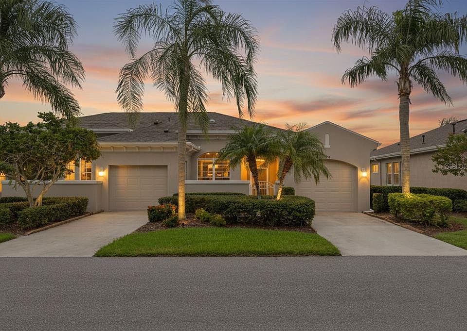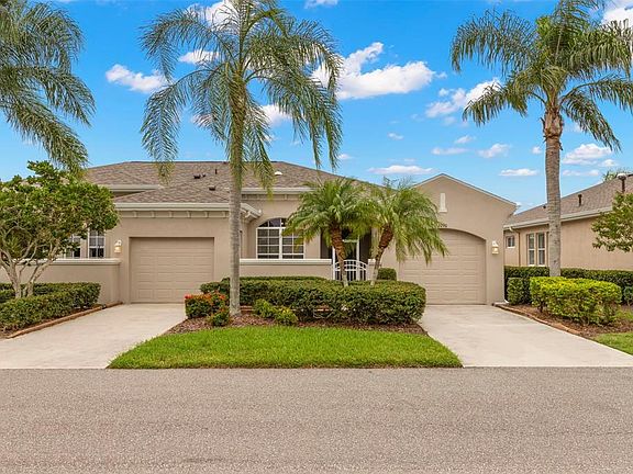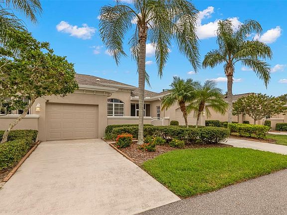Under contract-accepting backup offers. One or more photo(s) has been virtually staged. Welcome to this MAINTENANCE FREE lifestyle in the GATED community of Kings Point! Located on the 2nd hole of the Osprey golf course with AMAZING VIEWS in a PET FRIENDLY location! (2 pets allowed with NO weight restrictions), there is no CDD, No Flood Zone, short term rentals allowed and is part of the 80/20 rule where an AGE WAIVER is possible if under 55!! FEES INCLUDE roof repair/replacement, exterior paint, cable, internet, pest control, water, sewer, trash, lawn care and access to activities that include over 200 clubs, multiple indoor/outdoor HEATED pools, fitness, PICKLE BALL, an onsite SALON, two restaurants and so much more! Equipped with a BRAND-NEW HVAC (9/2025), this Chelsea floor plan has a courtyard that provides outdoor living and reception for your guests while the screened and covered porch provides shelter for your packages. Inside, the view of the ACTIVE GOLF COURSE is seen from the moment you enter! The foyer welcomes you with a striking tray ceiling with a height of 10' 8", complemented by generous space ideal for a drop zone and bench seating. The living room boasts the same stunning high tray ceiling and offers room for oversized furniture. The kitchen is a true culinary haven, featuring GRANITE countertops, stainless steel appliances including GAS range, and an abundance of wooden cabinetry, complete with Lazy Susan corner cabinets and roll-out shelving. There is a pass-through into the living room which makes for ease of serving. The EXPANDED lanai measures an impressive 14' x 16' 8" and UNOBSTRUCTED VIEWS and absence of immediate neighbors. The split floor plan includes a spacious primary bedroom that can easily fit king-size furniture, provides space for a sitting area, and boasts a tray ceiling. The en-suite bathroom has tall cabinetry, GRANITE countertops, dual sinks, a walk-shower with glass enclosure and a separate water closet. Storage is no issue with the spacious walk-in closet featuring wrap around shelving and 10’ ceilings. The second bedroom is filled with natural light, a walk-in closet, and a nook that’s perfect for storing some of your furniture out of sight. This room has quick access to the second full bathroom which offers the same finishes as the primary along with a tub/shower enclosure. The third bedroom has double door access, a wall of windows that floods the space with natural light, and ample room to create an office while still accommodating a third sleeping area. The laundry room is equipped with the same updated cabinetry as the rest of the home and front load appliances. The TWO garages (12' x 21' each) and extended driveways provide MORE STORAGE ROOM and ease of parking than a standard two-car garage! Additional features and updates include solar tubes, arched doorways, ceiling fans throughout, and NO carpet! This home is located close to the Second Entrance and the South Clubhouse that offers one of the resort-style outdoor community pool areas with a large deck for cookouts. Live music, community pool party events or get a great water workout with a swim in the indoor lap pool or a walk in the indoor aerobics pool. There are many events that take place including dances, parties and movie nights and Casual dining at Café Le Perk in the North Clubhouse! If you plan on venturing out there is quick access to restaurants, SHOPPING, beaches & 30 minutes to Tampa International Airport, less than an hour to the Sarasota shops and 20 minutes to Ellenton Prime Outlets!