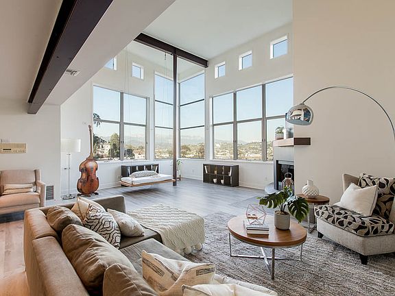Architectural Home with spectacular panoramic city and mountain views with one of the best parking locations in Silverlake. Benning Design Associates winner of the Andyz Awards celebrating excellence in Design personally redesigned and remodeled kitchen, downstairs bathroom as well as several conversational pieces throughout. Kitchen features beautiful custom gray cabinets with caesarstone and high end stainless steelappliances . Master suite is on the top level featuring a private bath with double sink, walk-in closet, sitting area with cathedral ceiling and skylight above with built-in bookshelves and wrap around balcony feasting on the amazing beauty with 360 degree views. The living room is spectacular with 15 foot window views also seen from upper level kitchen, updated fireplace with modern custom shelf and newer fireplace insert with glass beads wrapped in maxfine dark depth. Custom wood swing platform hung via aircraft cable, wired for surround sound, new vinyl laminate, 12 foot photography art "Half Moon Bay Breakers"ink on canvas by Donald Satterlee adds an interesting conversation piece. Music studio with large storage area along with washer/dryer access with sink and built-in cabinets. Newer tankless water heater, newer hvac system, central vacuuming,brand new custom glass garage door and opener. This is a show stopper that you have to see to believe!