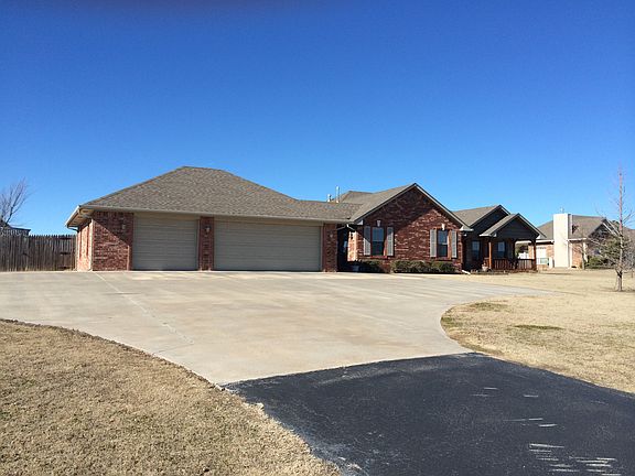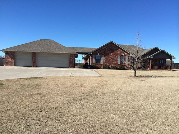 Beautiful 2293 sq. ft home on 1.3 acres with 3 car garage 864 sq. ft, 3 bedroom, 2 bath. Open dining room, breakfast nook, 2 living rooms. Large fenced back yard that's divided. great place for garden, 2 cojac buildings 12x20 & 8x12. Nice 8x11 storm shelter. 3 car garage with attic space built in 2007. Quiet place to live with great neighbors. Built by Merrick Home Construction . Friend, AmPo school district. If you have any questions or would like to see property please call 405-574-6030