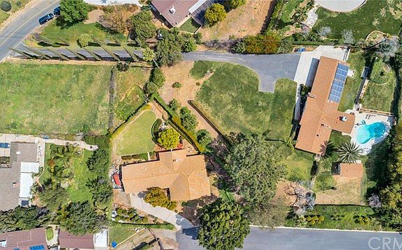 SPECTACULAR SECLUDED HILLTOP HOME IN GRAND TERRACE. 22907 Grand Terrace Rd is a one-of-a-kind property on an acre+ lot with private, elevated sunset mountain and city light views. This unique, custom-built pool home displays Mid-Century charm and character, but with all the modern conveniences. The exterior features a pool and spa for those hot summer days, a gas fire pit, a 100+ yard private driveway (plumbed for a security gate), ample parking for an RV or 8 vehicles, a fenced-in backyard, numerous fruit and cypress trees, mature vegetation, and a dog run. The lovely rolling front grass area is great for chipping golf balls from your front door, dining alfresco, or soaking up the sunset views. The main property offers 3 bedrooms/2 baths, two one-of-a-kind custom brick fireplaces containing stunning hand-laid rocks, numerous windows welcoming natural light into the home, custom stone countertops, engineered hardwood plank flooring, 3 solar-tube sky lights, a newer roof, red wood framing, a gable exhaust fan, and loads of storage. Additionally, the property includes a 1 bedroom casita with a full bathroom, great for multi-generational families or rental income. A newer solar system with 28 panels that virtually eliminates the electricity cost.If you are searching for a private, secluded, hilltop home that's also close to freeways, schools, dining, a new dog park, and shopping, then welcome home to 22907 Grand Terrace Rd.