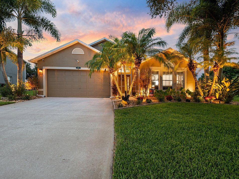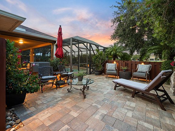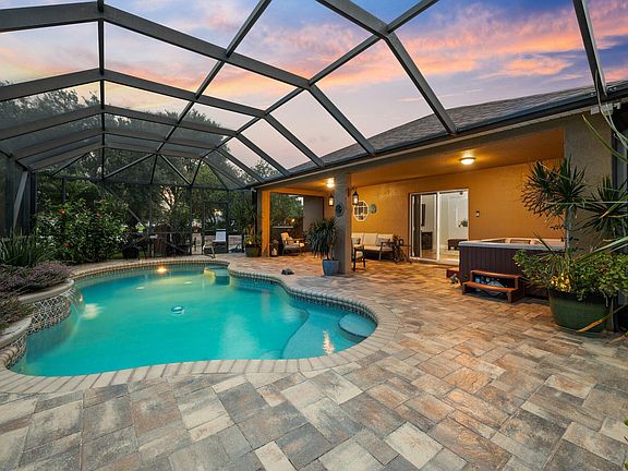 Welcome to your dream home, in the gated Eastwood community! Nestled at the back of a tranquil cul-de-sac, your fully renovated home offers some stunning amenities. Enjoy picture-perfect sunsets from your bug-free screened west-facing lanai/pool, or relax in the hot tub, included with all accessories. Check out your magnificent water-sealed paver patio in the fenced side yard; perfect for outdoor gatherings, or just to let the furry kids roam. You get a new (2023) roof and gutters, an upgraded irrigation system, and that awesome bonus side yard. Inside, you'll find NO carpet, as all flooring has been replaced. High-end, programmable under-counter lighting, included washer and dryer, and ALL LED lighting throughout the house. Ring cameras are included with the house, as well as the alarm system. Much of the furniture is negotiable, so if you see something you like, ask about it. This home is nearly perfect. Make your offer on this one quick!