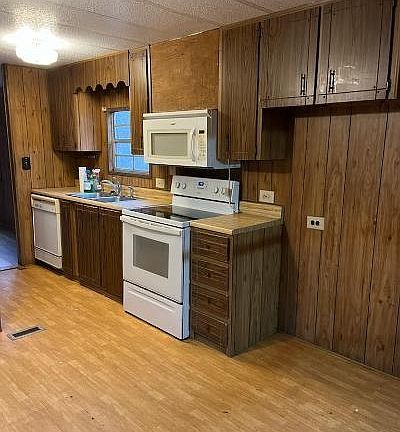Singlewide on large lot with many extras conveniently located on a no thru traffic street. Two bedrooms and one and half baths on over an acre. For outside enjoyment there is a large front deck and extra large rear deck overlooking a creek and woods. Eat in kitchen with microwave, range and dishwasher. Two separate bonus rooms / flex space are unheated but have window ac units and could have many uses. Detached building measures 20' x10' with cabinets, shelving and attic/loft. Fenced yard Property is being sold " AS IS " Seller is motivated !