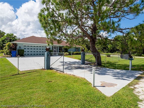 Take a look at this marvelous 3 bedroom 2 bath home nestled on nearly one acre of land! This well manicured lawn is lined with 5 ft tall chain link fence throughout the perimeter with double gate entrances in front and rear of home. You will be welcomed into the living room with cathedral ceilings and tile flooring throughout the living area. Master bedroom is equipped with a sizeable 12x8 walk-in closet. Spilt floor plan offers privacy for guest and family with the other bedrooms located on the opposite end of home and a renovated guest bathroom. Centrally located kitchen with updated appliances also has a 8x5 ft pantry for extra storage. The family room will flow into the rear screened porch with multi sliding patio doors able to be tucked away while enjoying the Florida sunset or entertaining guests. A paved walkway connects the home to the rear carport to reduce the chance of tracking dirt into the home. The two car garage has been fitted with a screen door, you will find the utility room tucked away with a mud sink and extra space available for storage. The front driveway has been extended about 4 ft on each side to allow extra parking of vehicles. Also located behind the home is a 40x35 ft open metal car port installed in 2022 with solar activated LED lights and soaring 19 ft tall ceiling. The carport could also be enclosed and turned into a workshop. Throughout the lawn newer irrigation has been placed to supply water to the many fruit trees such as guava, avocado, banana trees, and many others. Enjoy the serene Florida country feeling while being minutes from local shopping centers and restaurants. There are also many lakes nearby for fishing and enjoying a nice day on the lake.