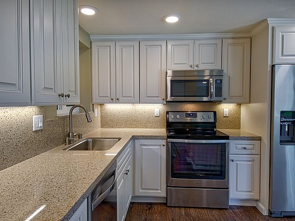 Priced Reduced. This lower Castilla end unit has been completely remodeled by Silas Luke Design for the discerning buyer who seeks no-compromise quality, comfort, efficiency, and style. The expanded entry leads to an all-new, open plan kitchen, with quartz counters and matching backsplash, solid wood cabinetry, and an island with room for seating. The counter-depth refrigerator completes the upscale look and is part of a suite of stainless steel Whirlpool appliances. The living room is graced by an elegant and hard-to-find wood burning fireplace and opens to an oversized wrap-around balcony with views of mature trees and mountain tops. Exceptional comfort and quiet are ensured by energy-efficient, dual pane windows and sliding glass doors plus a central air conditioning and heating system a rare luxury in this community. Its all here new floors, scraped ceilings, recessed LED lighting throughout, new bathrooms with step-in shower in master, as well as a full size LG washer and dryer. The cherry on top this highly desirable location is steps away from public transportation and all that Laguna Woods Village has to offer seven clubhouses, five pools, two golf courses, equestrian center, tennis, and so much more. Welcome home.
