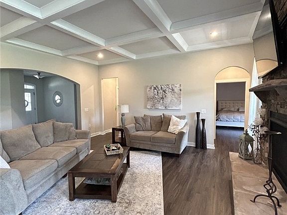 - Ceiling Fan(s), Coffered Ceiling(s), Kitchen Island, Open Floorplan, Pantry, Stone Counters, Recessed Lighting, Walk-In Closet(s)
