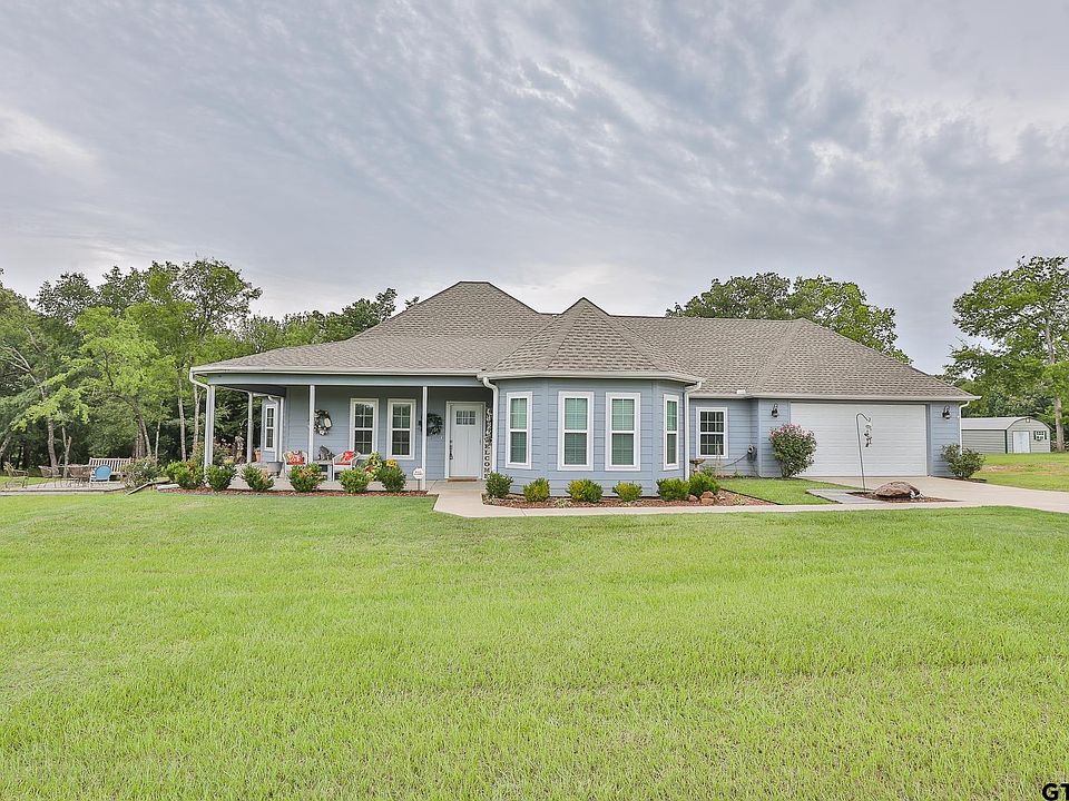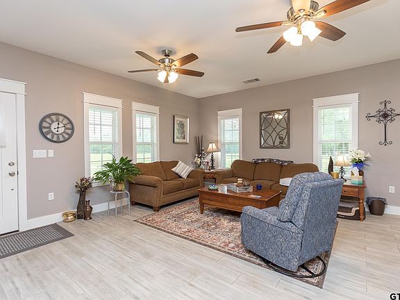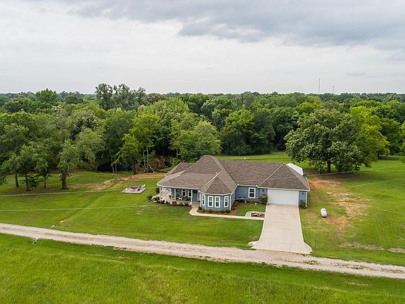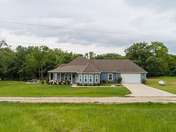 Welcome to this custom built home with wood details throughout. Drive up to green fields, a pond and the wrap around porch. The open floor plan that provides views from the living room to kitchen and dining room. The floor-to- ceiling windows allow tons of natural light! Custom wood cabinets in the kitchen have lots of storage for all those pots, pans, and tumblers..hehe! This eat-in kitchen has plenty of room for everyone to gather around! Heading to the Primary there's a custom wood panel accent wall and the Primary custom barn door. The large Primary bath has custom wood cabinets with double sinks and a large soaking tub. Custom wood paneling continues into the garage that is as insulated as the home! The 14x24 workshop has electricity and is perfect for a man cave or at home office. This wrap-around porch provides plenty of opportunities to watch the deer and other wildlife. Contact Robin Sherwood (214) 505-3010 to schedule a time to view this beautifully hand crafted country home!