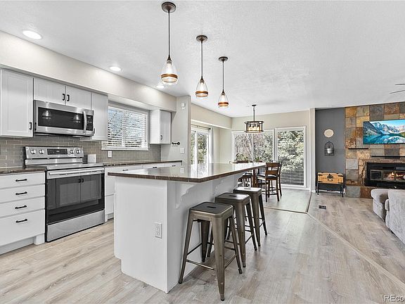 Welcome to this incredible ranch home nestled in the serene and well-established Hutchinsons Green Mountain Village community in Lakewood. Experience unparalleled tranquility and peace in this charming abode on a desirable cul-de-sac street. You'll fall in love with the expansive private backyard, where you'll be greeted by a sprawling flower garden that adds a burst of color and beauty. Enjoy leisurely evenings on the huge paved patio, surrounded by an apple tree and flowering sweet peas. Enclosed by lush greenery during the warmer months, the backyard offers complete privacy, ensuring you can relax without any distractions and revel in mountain views. Inside, the home boasts ample space for both formal and informal living, highlighted by two cozy fireplaces—one on each floor—to keep you warm and snug during chilly evenings. The walk-out basement offers two additional living spaces, perfect for various activities and gatherings. Indulge your culinary skills in the gorgeous remodeled kitchen, equipped with stainless steel appliances and featuring an additional dining nook for casual meals or intimate gatherings. The main level hosts three generously sized bedrooms, each adorned with sliding barn doors for added character. The primary bedroom boasts a stylish en-suite bath. For added convenience, there's an additional bedroom in the basement with a private door to the full bath, making it ideal for accommodating guests. This home has been meticulously maintained with newer updates throughout, including EV port added to the garage, cedar hardwood floors, new trim and doors, resurface outside deck with composite materials to name a few highlights. Walk to Bear Creek State Park and Trail North right behind the home, and quick access to shopping, dining, and major roads. With its move-in-ready condition and rare combination of tranquility, privacy, and modern comforts, this property presents a truly exceptional opportunity to call it your own. Welcome Home!