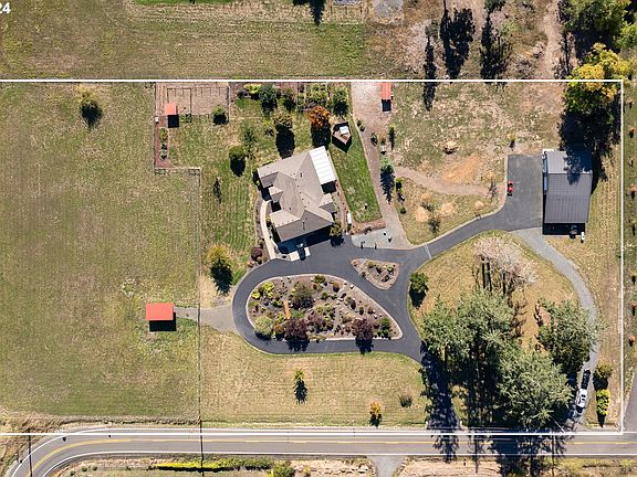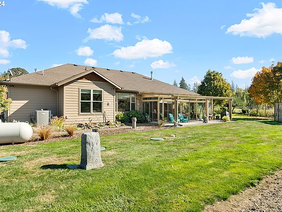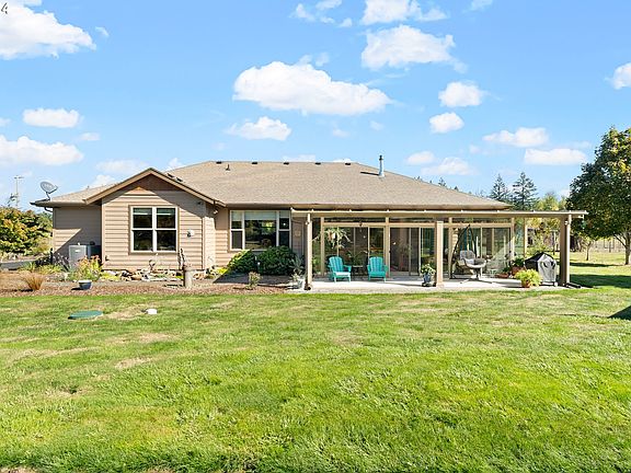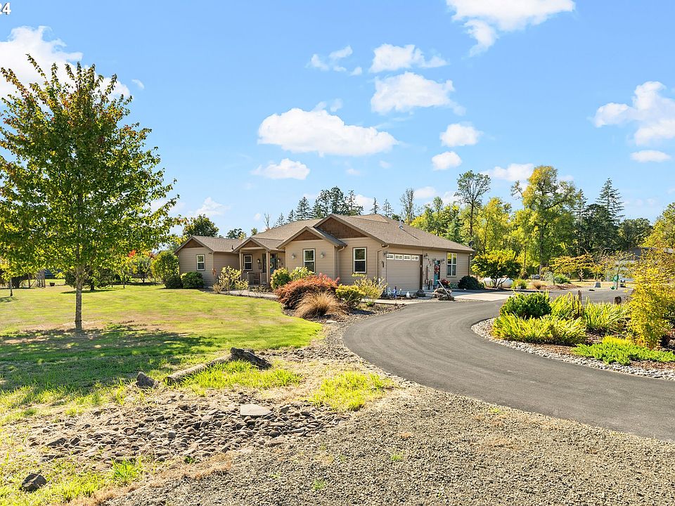 This stunning, custom-built, single-level home combines modern comforts with thoughtful outdoor features on a spacious property. Upon entering, you'll be greeted by the airy 9' ceilings throughout, enhancing the sense of openness. The great room concept features a new gas fireplace, wood mantel, and surrounding stone work. The primary suite featuring a walk-in shower with dual shower heads and a spacious walk-in closet. The home’s wide hallways and doors make for easy accessibility, adding to its thoughtful design. The expansive 450+ square foot sunroom, complete with a mini-split system for heating and cooling offers a peaceful retreat with views of the beautifully landscaped property.Homestead enthusiasts will appreciate the 1.25-acre pasture with a shed, perfect for livestock, and the fenced garden area featuring raised garden beds, a berry patch, fruit trees, and a chicken coop. A seasonal water feature with bridge and a separate coy pond add to the tranquility to the landscape. Seven frost-free hose bibs are strategically placed around the property for easy watering.The large shop/pole barn is a versatile space with 220 electrical, a propane heater, large overhead doors and additional covered parking attached. A newly paved driveway leads to the attached two-car garage, providing ample parking and convenience. The home is equipped with high performance mechanicals including a 3 phase water filter system, furnace with air purifier, and an additional electrical panel with generator included to keep you going when the power goes out. This home offers both beauty and functionality, set on a serene property with plenty of room to enjoy country living at its finest.