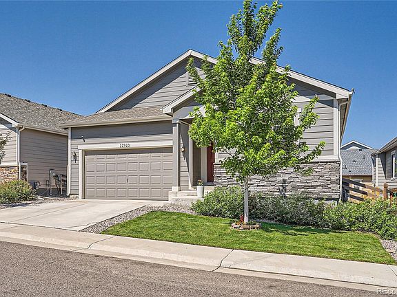 PRICE REDUCED! Brand new carpet and roof. Open concept featuring home office with built-ins, tall ceilings, finished garden-level basement, and a full-width covered deck with mountain views. Elegant custom landscaping highlighted by the grass-jointed patio and app-controlled illumination - plenty of room for entertaining or a trampoline. Luxury quartz counters, double oven, vinyl plank floors, large living room, deck gas grill line stubbed, and huge spa-style master shower. Vivint security system with doorbell and driveway camera. Pre-wired for whole-home audio system. Nestled away from traffic but easy access to schools, shopping, and E-470. Neighborhood park, pool, and splash pad just a few blocks away.