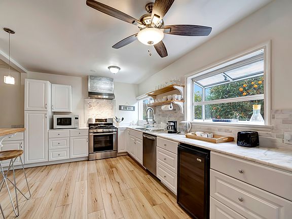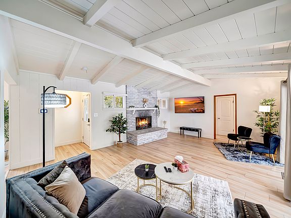 Discover this stunning 4-bedroom estate with a guest house in Walnut Acres, set on a spacious flat lot with dual gates leading to an elegant circular driveway adorned with fruit trees. This charming single-story ranch home boasts a fully equipped kitchen, making entertaining a breeze, along with a beautifully furnished central family room featuring a vaulted ceiling and a mantled brick fireplace that seamlessly connects to the dining area.