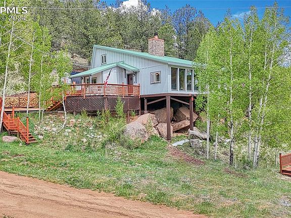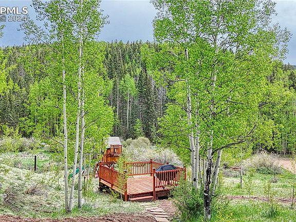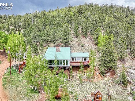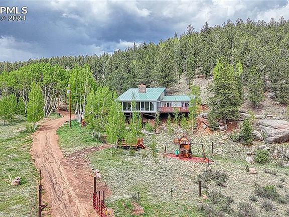 Discover this spacious 2-bedroom, 2-bath home nestled in the highly desired community of Cripple Creek Mountain Estates. Situated on a stunning 2.74-acre parcel, this property is tucked away among the aspens and pines, offering a serene and private retreat. The home features an abundance of storage, a sunlit family room with passive solar design, an open concept floor plan and a brand-new wood stove. Recent upgrades include new plumbing, heating, flooring, forced air heating system, circuit breakers, new steel roof, granite countertops, fresh exterior paint and a beautiful tongue and groove ceiling. Every room has been thoughtfully updated for your comfort and enjoyment. The expansive kitchen boasts ample cabinets, new appliances, and a cozy eat-in area, making it perfect for large gatherings. This home is equipped with a whole house generator and multiple outbuildings, ensuring convenience and preparedness. The expansive deck is perfect for outdoor entertaining, while the children’s playground and frequent visits from roaming elk add to the charm of this mountain retreat. Cripple Creek Mountain Estates offers a range of community amenities, including an indoor pool, workout room, picnic areas, tennis courts, disc golf, and more. Once you experience the tranquility and beauty of this home and its surroundings, you’ll never want to leave.