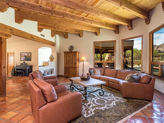 Enjoy privacy, casual elegance and abundant natural light throughout this exceptionally sited 1999 Stu Willoughby Southwest Territorial home- located in prestigious, 24-hour Guard-Gated beautiful Pima Canyon Estates. Incredible sweeping mountain and city views abound from this 1.16 acre elevated corner and cul-de-sac lot. Stunning giant saguaros and natural Sonoran Desert views from both patios and every window. Recent interior and exterior paint, soft curved walls, alder doors, beamed, planked and corbelled ceilings and gorgeous Mexican Saltillo flooring grace this comfortably spacious 3593 sf, 5BD (or 4+Study), 2.5 Bath, 3-Car garage w/34 feet of California Closets custom cabinets. Granite countertops, center island with storage, newer SS GE Cafe, Electrolux appliances,