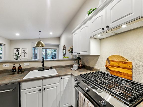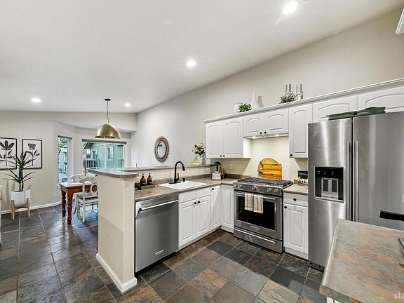 Updated townhouse in Tahoe Island Park! This beautifully maintained 1,736 square foot townhouse offers the ideal blend of comfort and convenience with its thoughtful layout and recent upgrades.Upstairs, you'll find an open living area featuring vaulted ceilings and plenty of natural light. The recently updated kitchen features brand-new stainless-steel appliances, including a gas range, complemented by a walk-in pantry and slate flooring. Step out onto the upper deck from the living room perfect for summer barbecues and enjoying mountain air.The primary bedroom has a private balcony, vaulted ceilings, and recessed lighting. Downstairs, a spacious family room with stunning hand-hewn hardwood floors and includes a wet bar with mini refrigerator ideal for entertaining.Outdoor living shines with the fully fenced backyard which offers a private space for relaxation.The townhouse's quality construction and meticulous maintenance ensure worry-free ownership, while its central location puts you moments from Lake Tahoe's beautiful beaches, extensive biking trails, and excellent dining and shopping options. The single car garage offers plenty of room for a vehicle and extra storage for all of the Tahoe gear. Whether as a permanent residence or low-maintenance vacation home, this townhouse offers the quintessential Tahoe lifestyle you've been dreaming of.