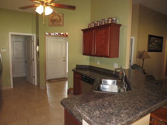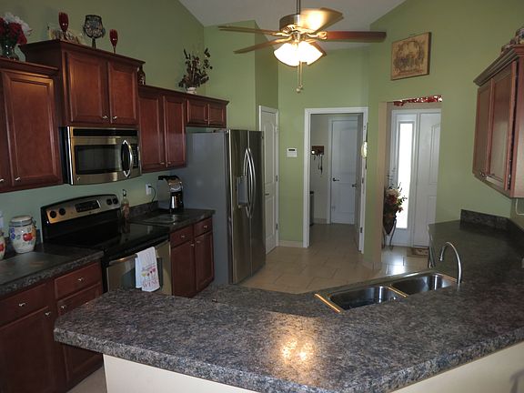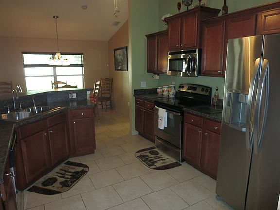 Beautiful home in the desirable community of Falcon Ridge. With its open floorplan and sitting on over a 1/3 of an acre this home is immaculate inside and out. Features include a master bedroom with walk-in closet, double vanity, garden tub & separate shower, a large eat-in kitchen with breakfast nook & bar, stainless steel appliances, and upgraded Cherry cabinets. The kitchen opens to a spacious family room which leads to a huge screened lanai overlooking the private fenced yard. Plus upgraded tile floors and tile baseboards, storm shutters, alarm system, 80 gallon solar hot water heater, irrigation system, and a huge 8x14 storage shed. Also 4th bedroom can easily be converted to a formal dining room per orignal plan. Conveniently located to beaches, shopping and restaurants. A MUST SEE!!