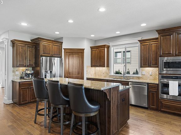 Welcome to the dream floorplan. 2 large ensuites + 2 standard bedrooms with a shared hall bath + bonus room + generous laundry room UPstairs. High ceilings and beautiful millwork throughout. Light filled great room with stylishly tiled gas fireplace surround, floor to ceiling cabinets and bookshelves. New stainless steel Thermador 36 inch gas cooktop and new GE Profile Café Professional series oven and microwave. Island with eating bar, walk-in pantry and extra cabinet storage. Enormous primary suite with views of Mt. Hood. Enjoy privacy in the resort like back yard whether you are grilling on the deck, down below on the fully paved patio around a fire pit, soaking in the salt water hot tub (negotiable), or playing on the lawn. New, custom exterior outlets and lighting for year-round outdoor living. Newly fenced with a gated dog run.  New vanity in powder bath, recessed lights in all bedrooms and the dens,  new interior paint, new custom blackout blinds throughout, and new Garage Door openers for the oversized 3 car tandem garage. This stunning ICON build served as the model home in 2008 when this coveted community around Douglas Park was built. Make yourself a part of this incredible neighborhood filled with kids!